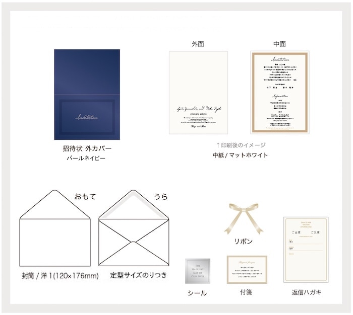 招待状の本文・封筒・返信はがき等を印刷した状態でお届けします。商品到着後、中紙等の折り曲げやリボン掛けをして仕上げてください。